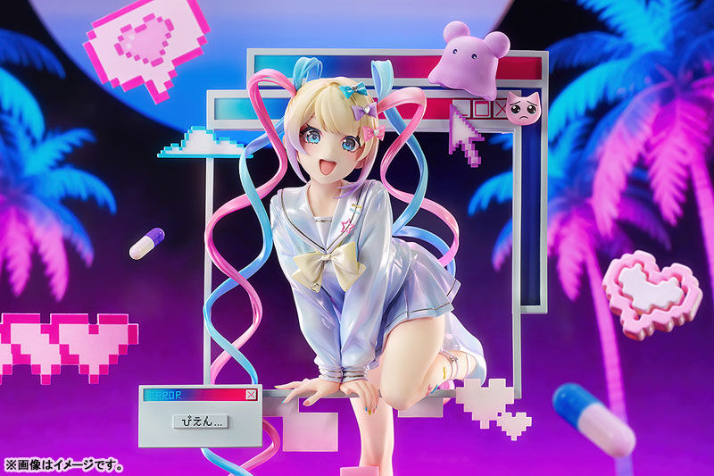 Her dynamic pose, appearing as though leaping out of a computer screen, has been carefully sculpted to the smallest details. Her lively eyes and expression have been faithfully captured in figure form. The outfit features a delicate pearlescent paintwork, giving it an elegant sheen that changes its appearance depending on how the figure is illuminated. The translucent base incorporates a staircase design, allowing for a stable yet seamless display. Be sure to add this figure of OMGkawaiiAngel to your collection!