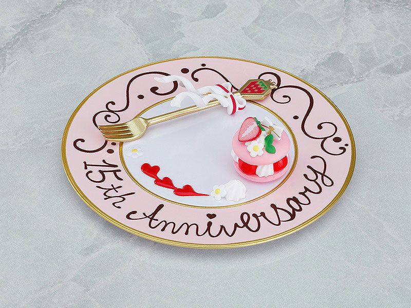 She comes with three face plates including a standard face, a smiling face and a blissful contented face. Optional parts include a strawberry-themed fork, a figure base made to look like a dessert plate and a delicious-looking macaron! Miku's gorgeous outfit adorned with strawberries and frills and her twintail hairstyle have been faithfully captured in Nendoroid form.
